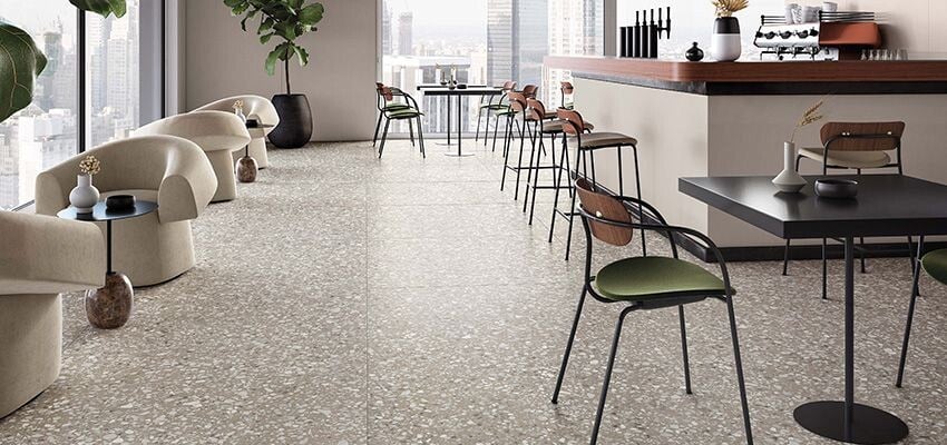 Casalgrande Padana’s Le Ville collection gives a modern twist to Venetian terrazzo tiles, among the most renowned and popular Italian creations throughout the centuries. Le Ville is a versatile collection that fits into any space, from floors to walls, both inside and out. The tiles with the anti-slip Grip finish for exteriors (20 mm thick) help create harmonious uninterrupted surfaces that seem to continue from the interiors. Le Ville is the perfect collection for large surfaces, such as hotel, restaurant, and shop floors, but it also adds style and character to any room in your home. Le Ville terrazzo-effect tiles are rectified and perfectly flat, making them, together with the large 120x120 cm format, ideal for creating elegant and contemporary uninterrupted surfaces with minimal grout lines.