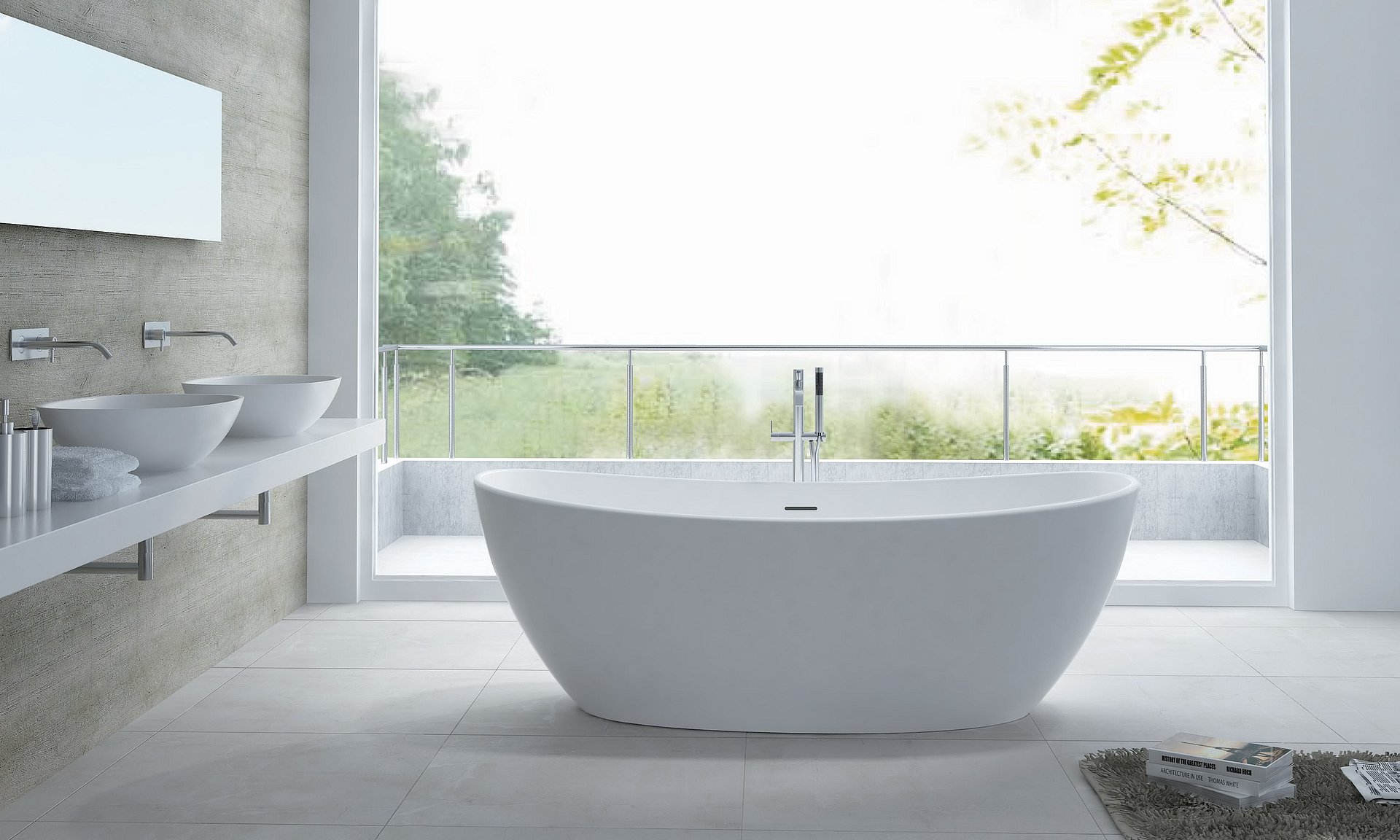 A composite stone bathtub from the Marcella collection.