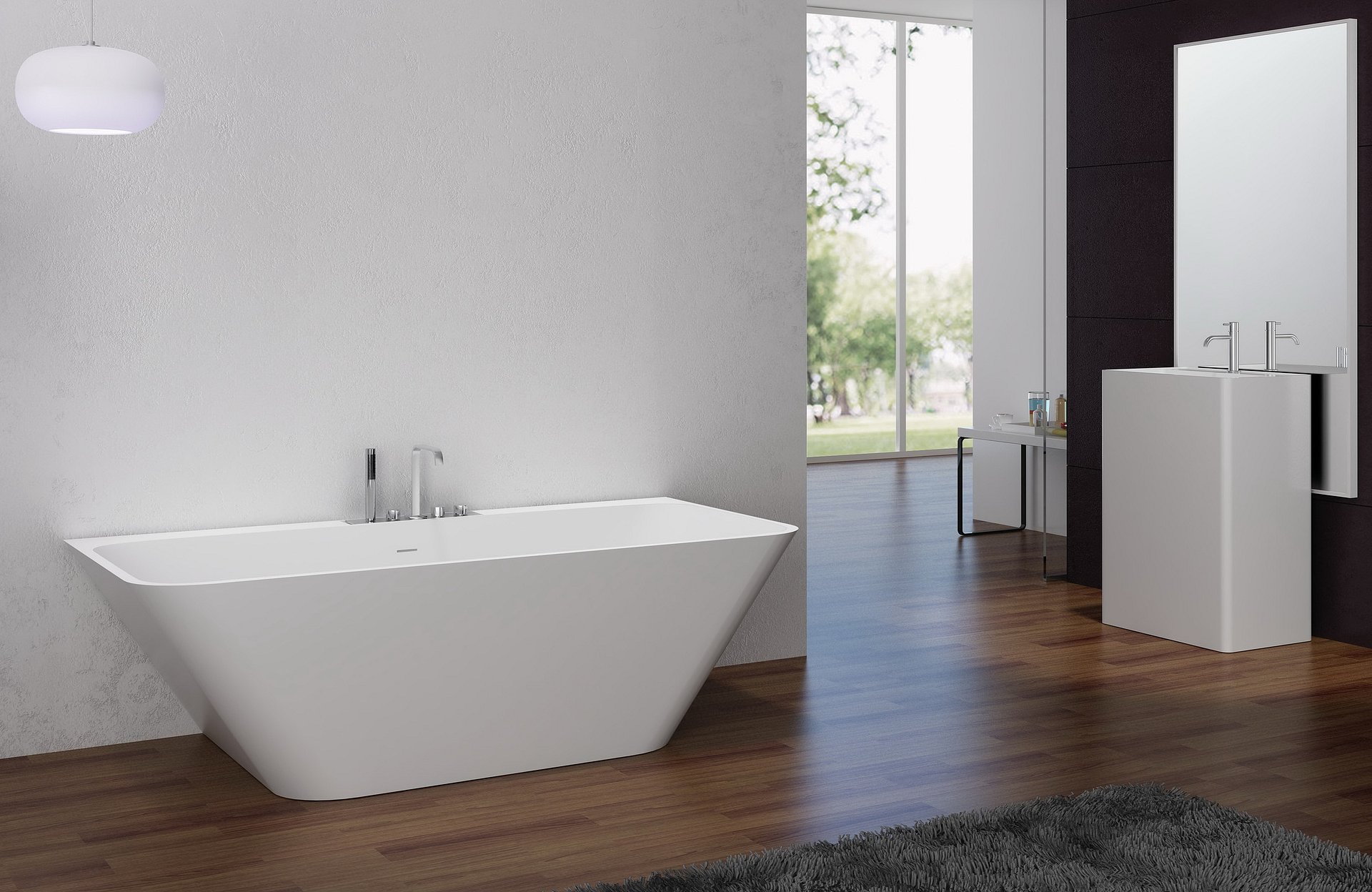 A composite stone bathtub from the Rubino collection.