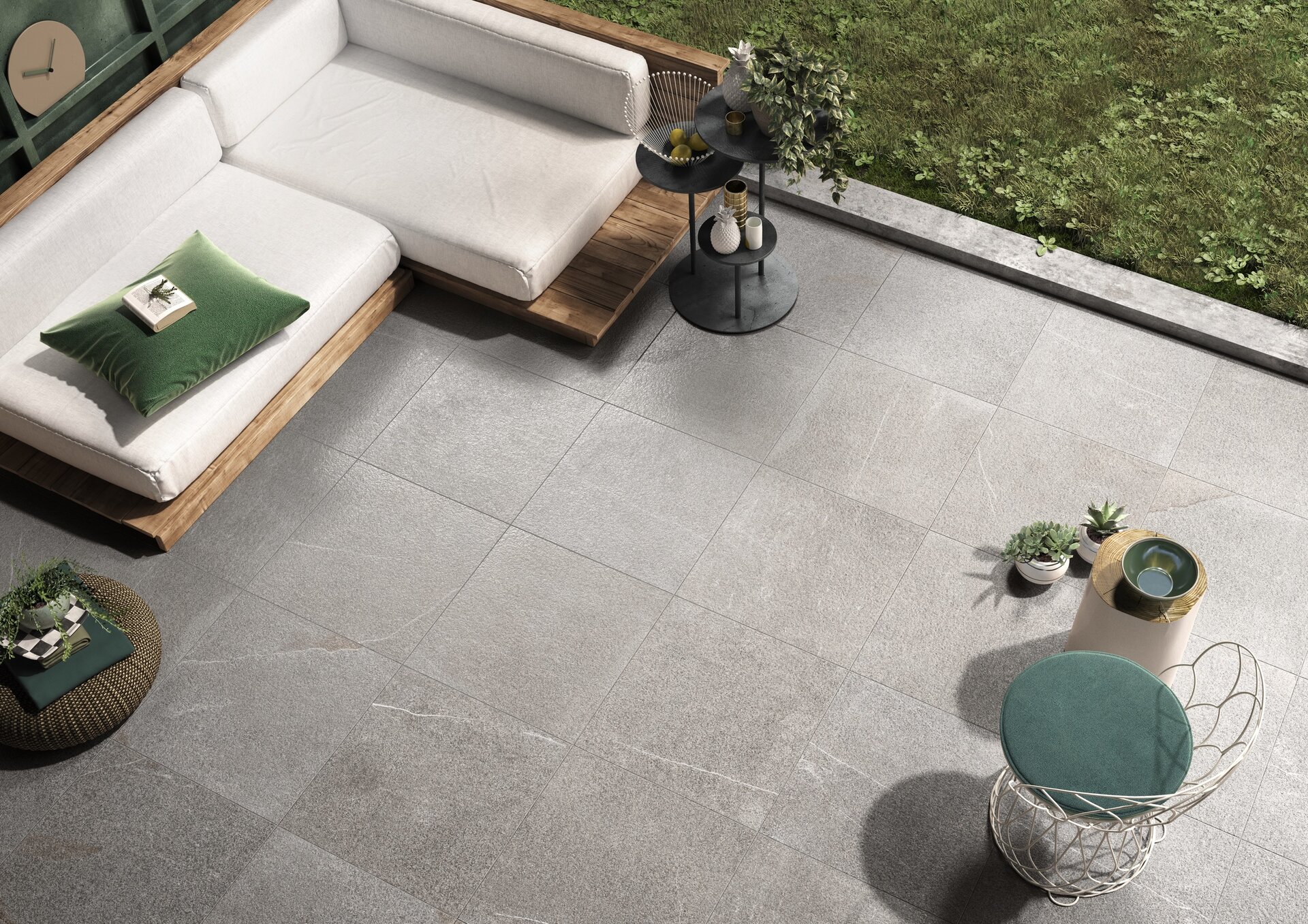 The flamed surface presents a bodly mineral appearance and a roughness typical of flamed stone. Conceived for external spaces thanks to its slip resistance coefficient of R11.