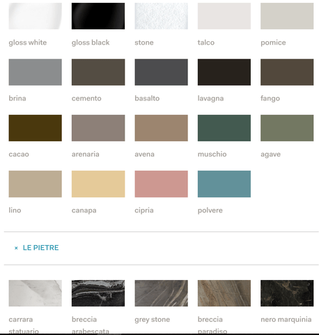 A selection of finishes ranging between the colors of "le Terre di Cielo", lacquers and wooden veneers, metals, marble, leather and all available materials.